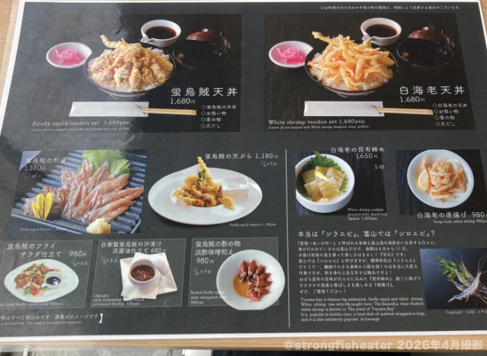 御膳以外のほたるいかメニューも豊富。4月ということで、ホタルイカメニューと解禁したばかりの白海老との二大巨頭!
