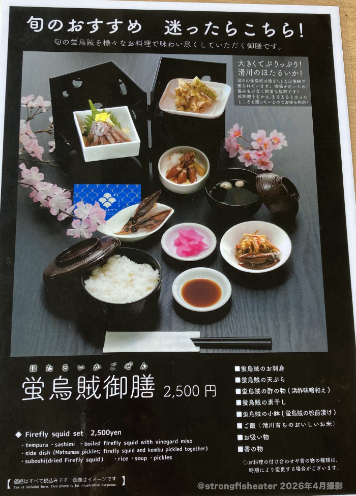 看板メニューはこちらの「蛍烏賊御膳」(3月20日〜5月31日限定での提供)!8割くらいの人がこちらを注文している印象でした。
